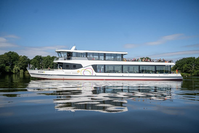 An Bord des modernen Ausflugsschiffes Möwe erleben die Gäste Live-Musik mitten auf dem Wasser. Das 2022 gebaute Schiff fährt komplett elektrisch und gleitet nahezu lautlos über den See – perfekt, um die Natur zu genießen und gleichzeitig ein außergewöhnliches Konzert zu erleben.